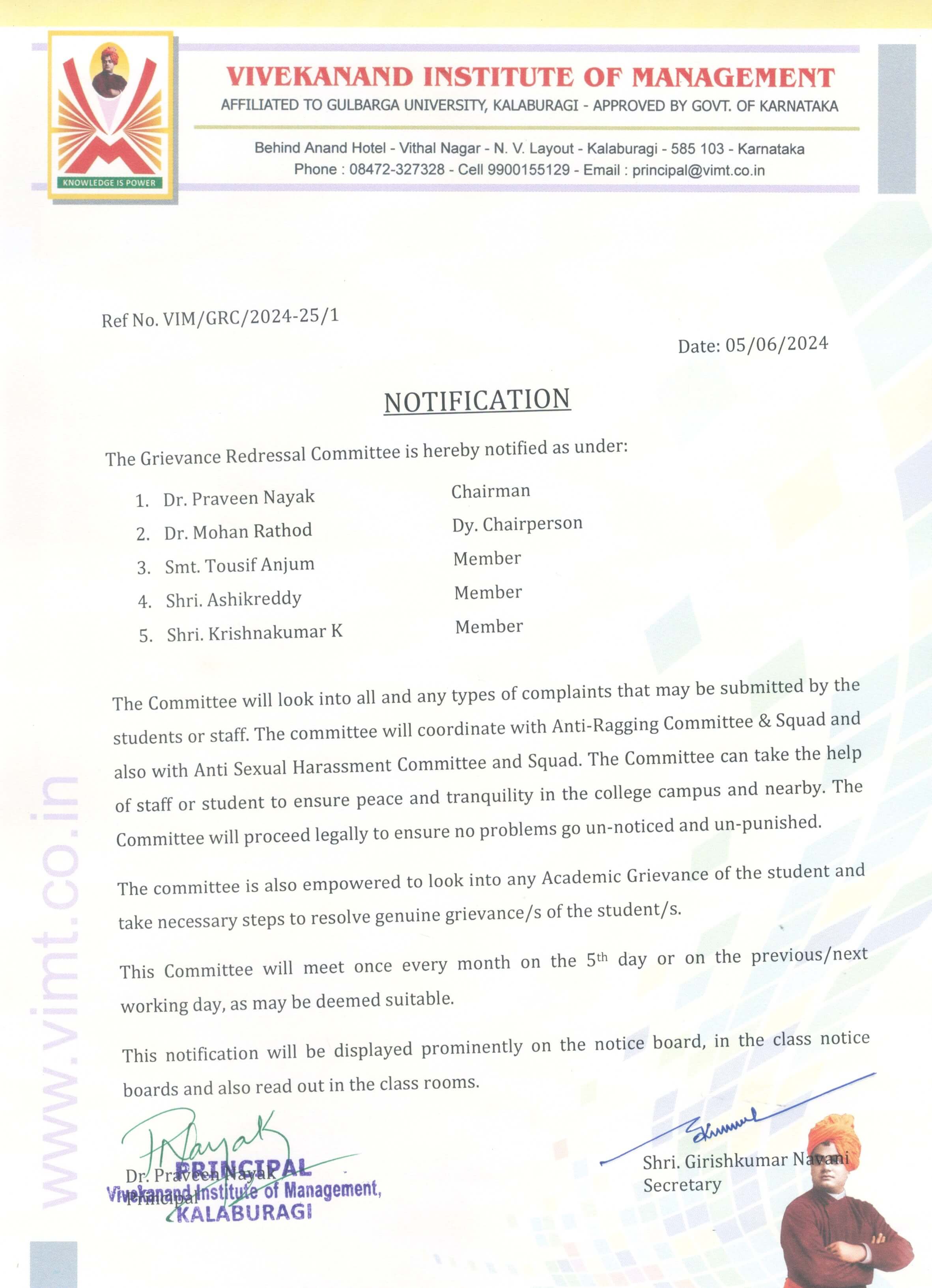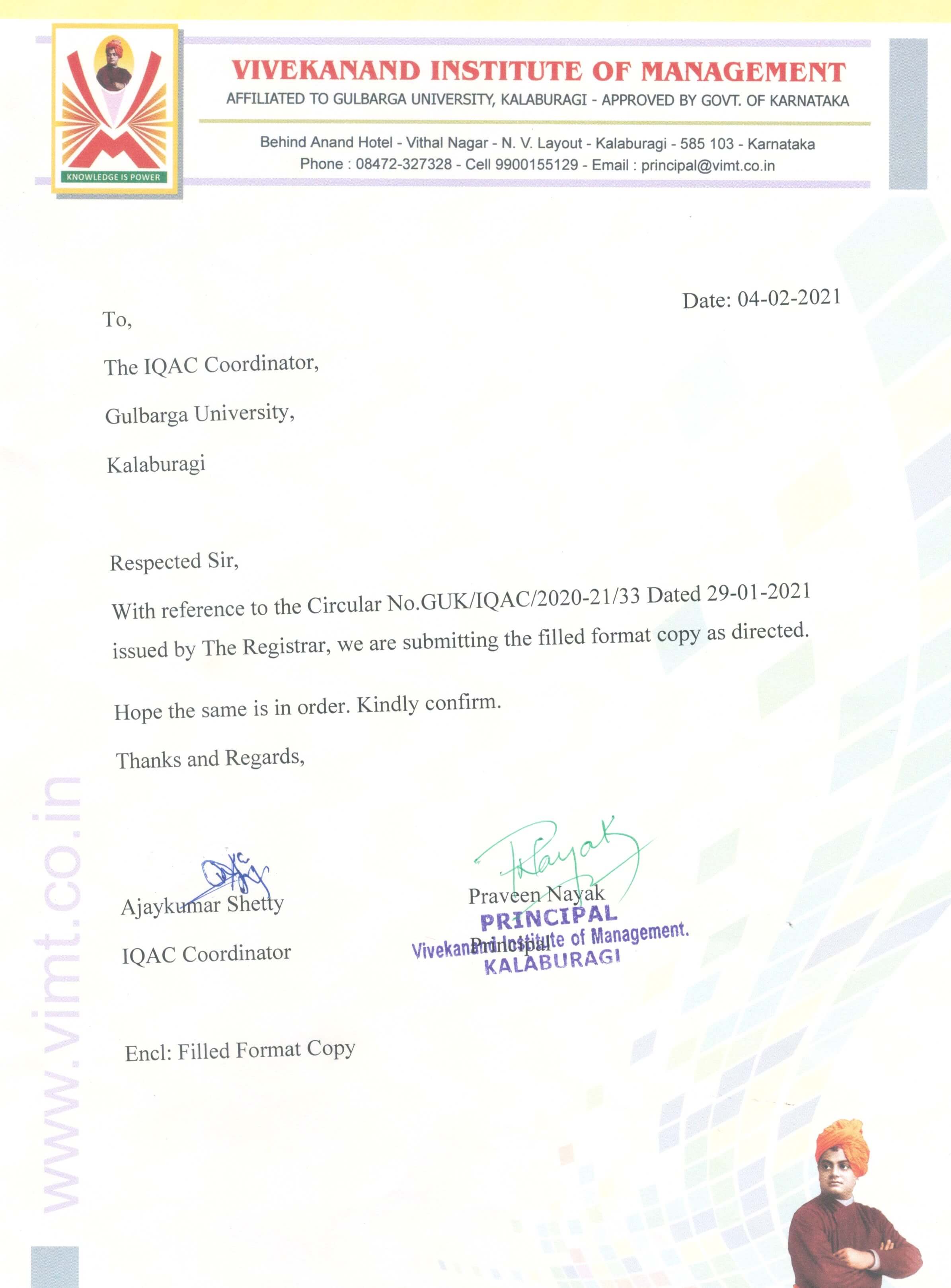 Dear Student, Welcome to Vivekanand Institute of Management, Hyderabad-Karnataka region well known B-School with multi-faculty and multi-facilities. In a global economic Scenario that is Constantly evolving, you need to constantly reinvent yourself and acquire the requisite competencies to stay ahead of the crowd. By imparting knowledge that has a blend of academics, practical training and overall persionality development, VIM iS Committed to grooming future Visionaries and leaders.